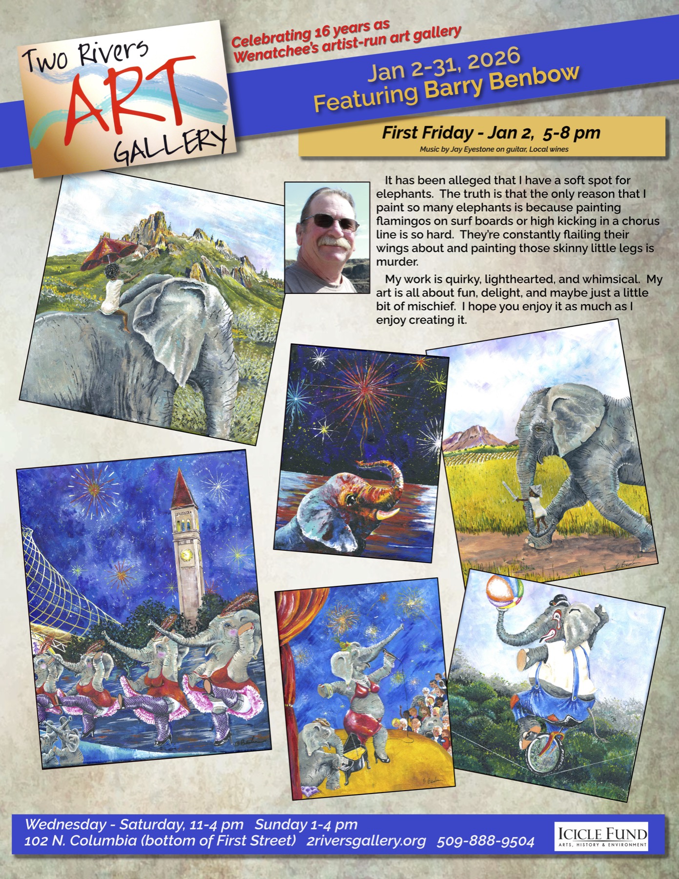 You are invited to Two Rivers Gallery First Friday for January / February 2026 5-8pm…..live music / local wines We will have a fun show by artist Barry Benbow |